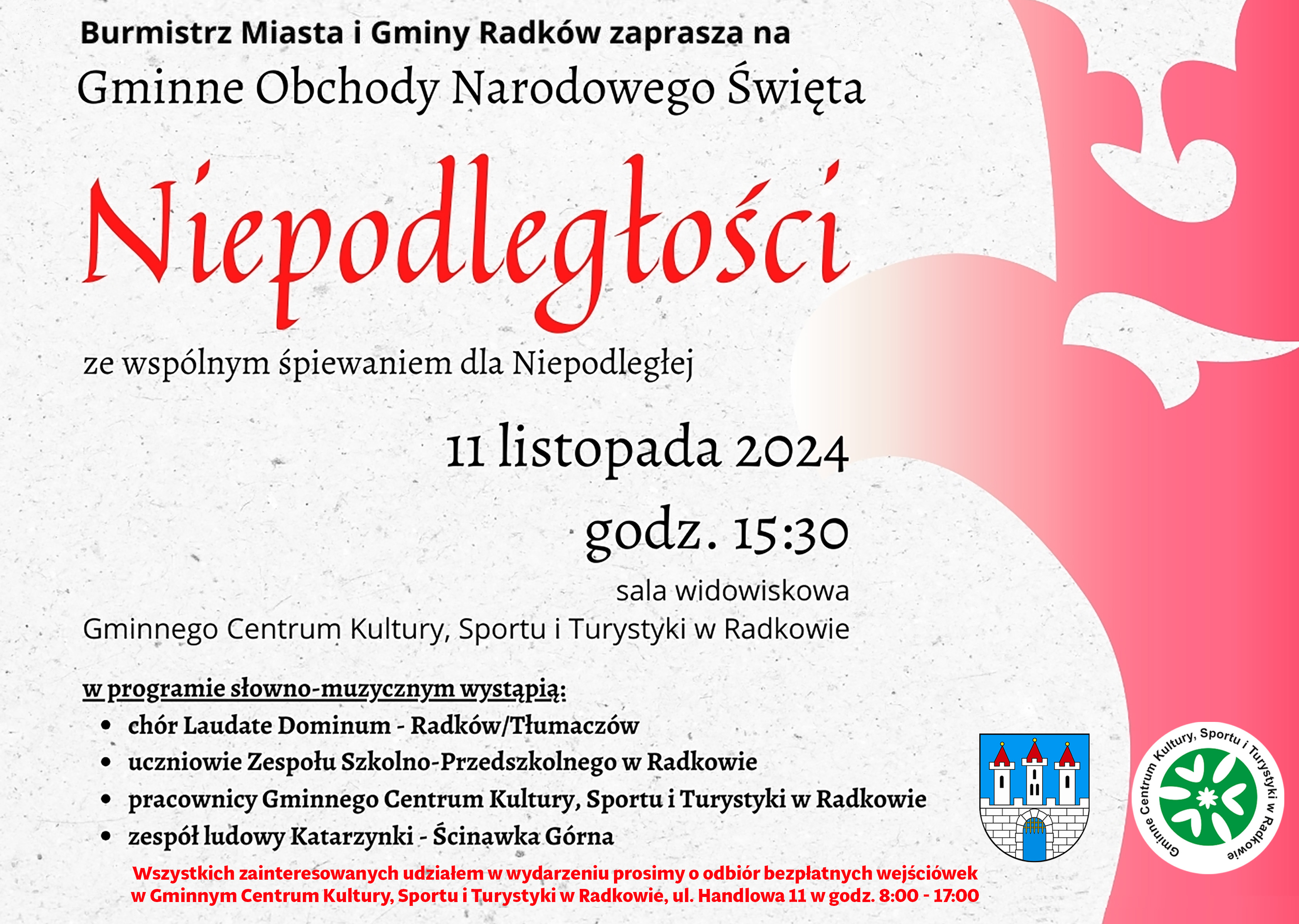 Zapraszamy na Gminne Obchody Narodowego Święta Niepodległości, 11 listopada na godz. 15:30 do Gminnego Centrum Kultury, Sportu i Turystyki w