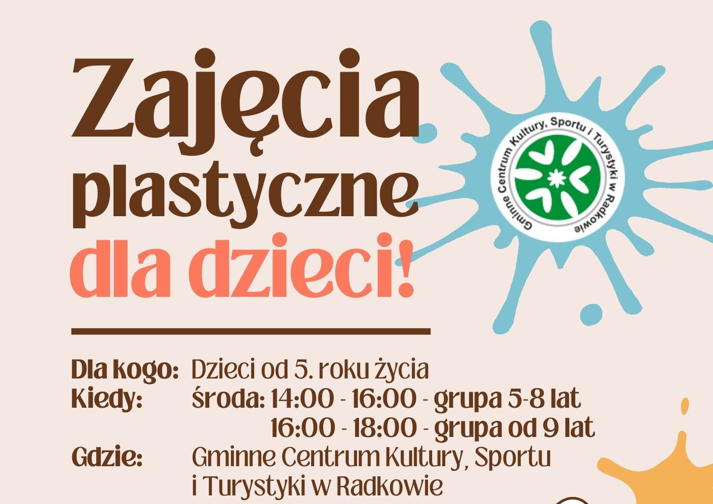 Czytaj dalejSerdecznie zapraszamy dzieci w wieku od 5 lat na zajęcia plastyczne do Gminnego Centrum Kultury, Sportu i Turystyki w Radkowie.